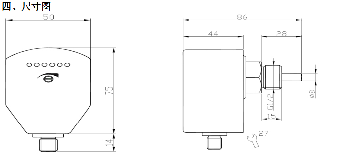 將流量開關裝好,使介質以需要監(jiān)測的流速流動,擰開面板上的螺絲,調整電位計, 使第一個綠色LED怡好變亮。此后當流速低于當前值時,開關就釋放(紅燈亮)。若要使開關點比當前流速小,可調整電位計(順時針旋轉螺絲刀)使綠色 LED多亮一些。
