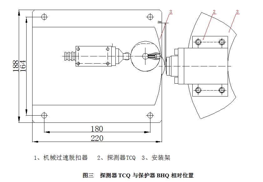 3、安裝過速保護(hù)器BHQ(由業(yè)主自己根據(jù)現(xiàn)場情況配裝,應(yīng)有足夠的空間供保護(hù)器完成手動復(fù)位)及過速保護(hù)器BHQ的安裝螺栓不能完全緊固,以便于后面調(diào)整,安裝時要求液壓閥中心高度與過速探測器在同一高度,同時脫扣裝置的一邊與主軸中心線重合(如圖三),然后鎖緊螺栓。