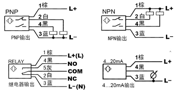 2、信號(hào)輸出:PNP,NPN,繼電器,模擬量(4~20mA)